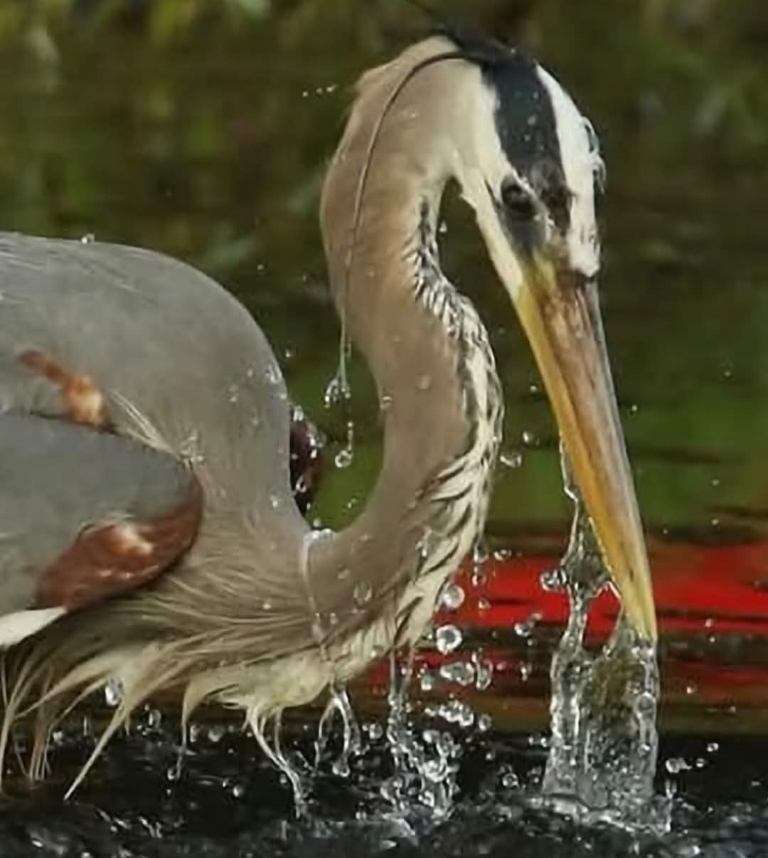 Like this one: a Great Blue Heron, photographed at a high shutter speed, stabs at something in the pond waters.